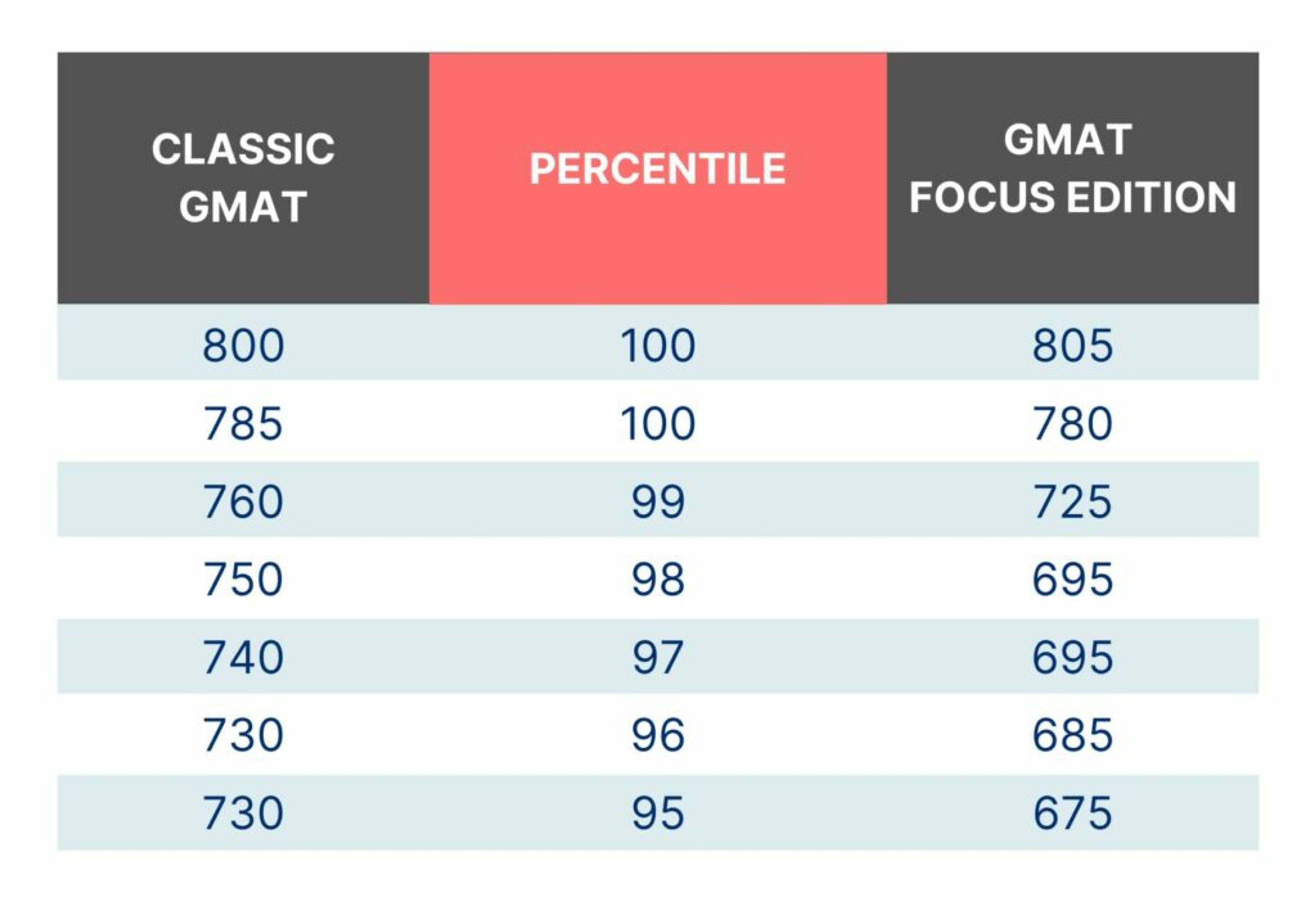- Total GMAT scores for the GMAT: Focus Edition range from 205 to 805 in 10-point increments. To distinguish them from scores of the older-edition GMAT exams, GMAT Focus Edition scores now end in a 5.
