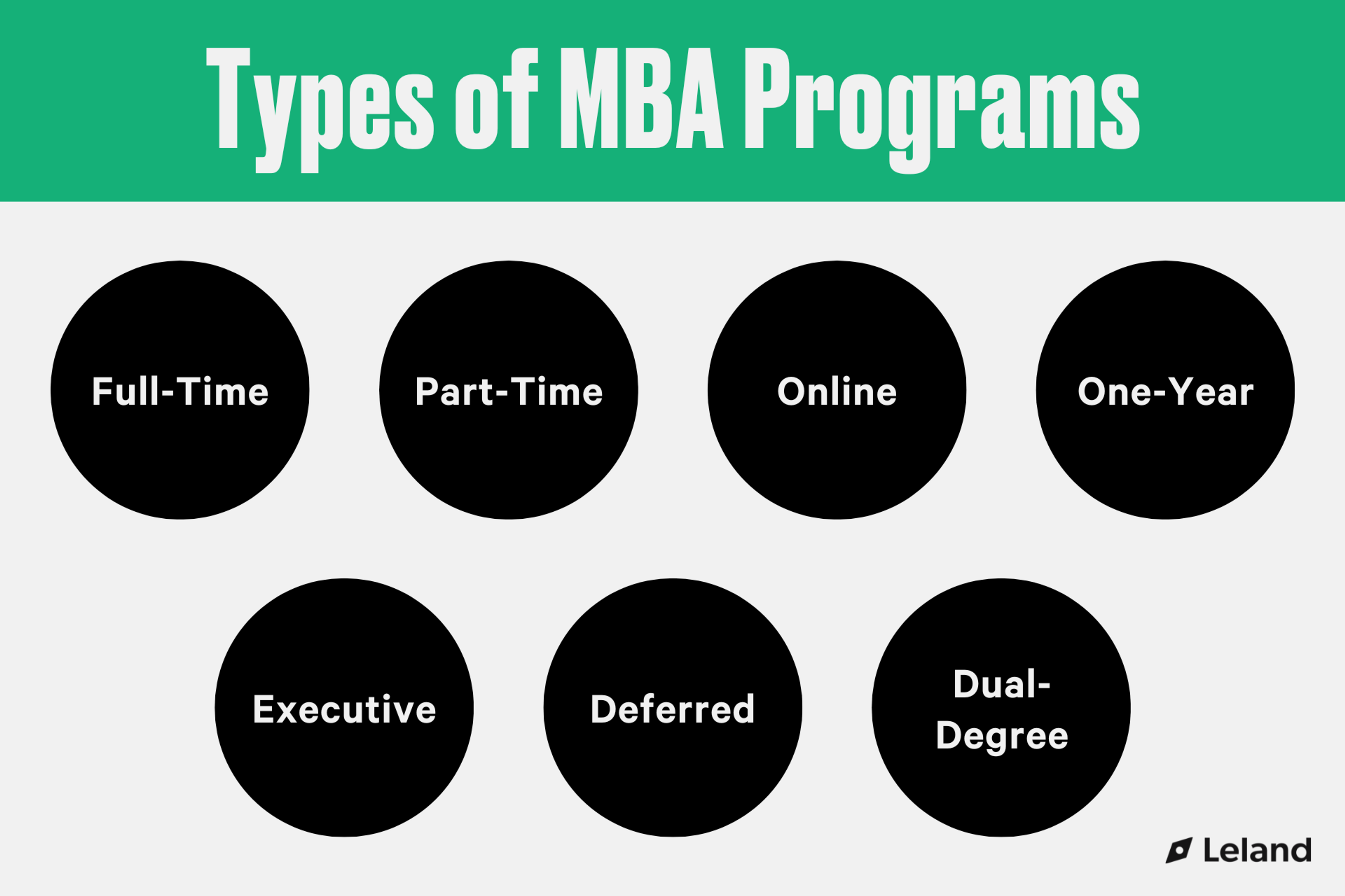 Each type of MBA program covers the same foundational topics, but may differ based on time commitments and specializations. The different types of MBA programs include: Full-Time, Part-Time, Online, Executive, One-Year/Accelerated, Deferred, and Joint-Degree.