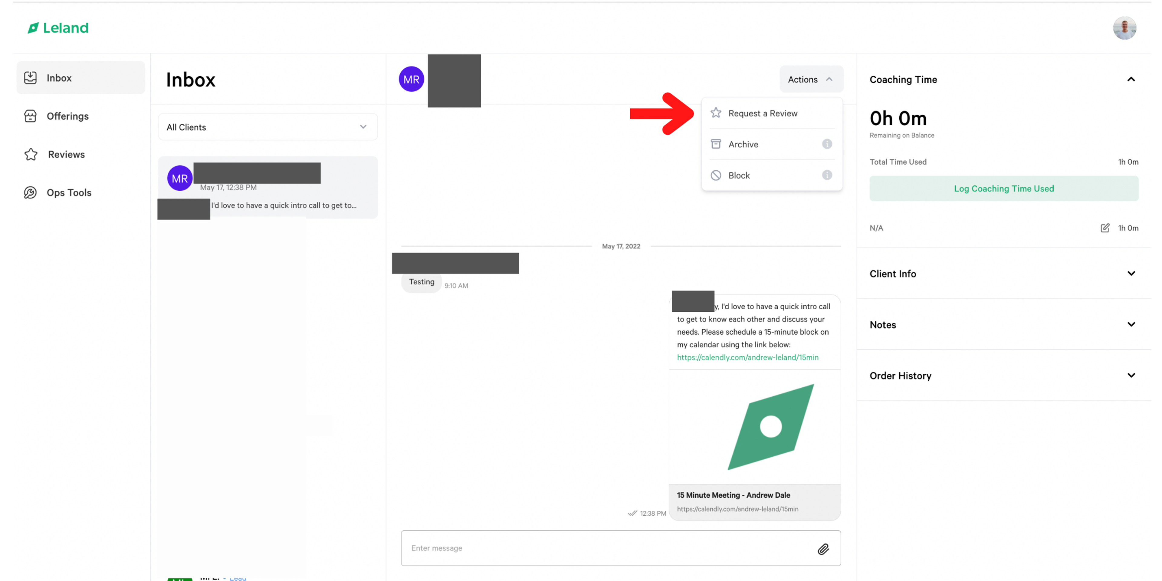 For your paid Leland clients, the process will look a bit different. After you have finished coaching, you’ll need to request a review from them in one of two ways.