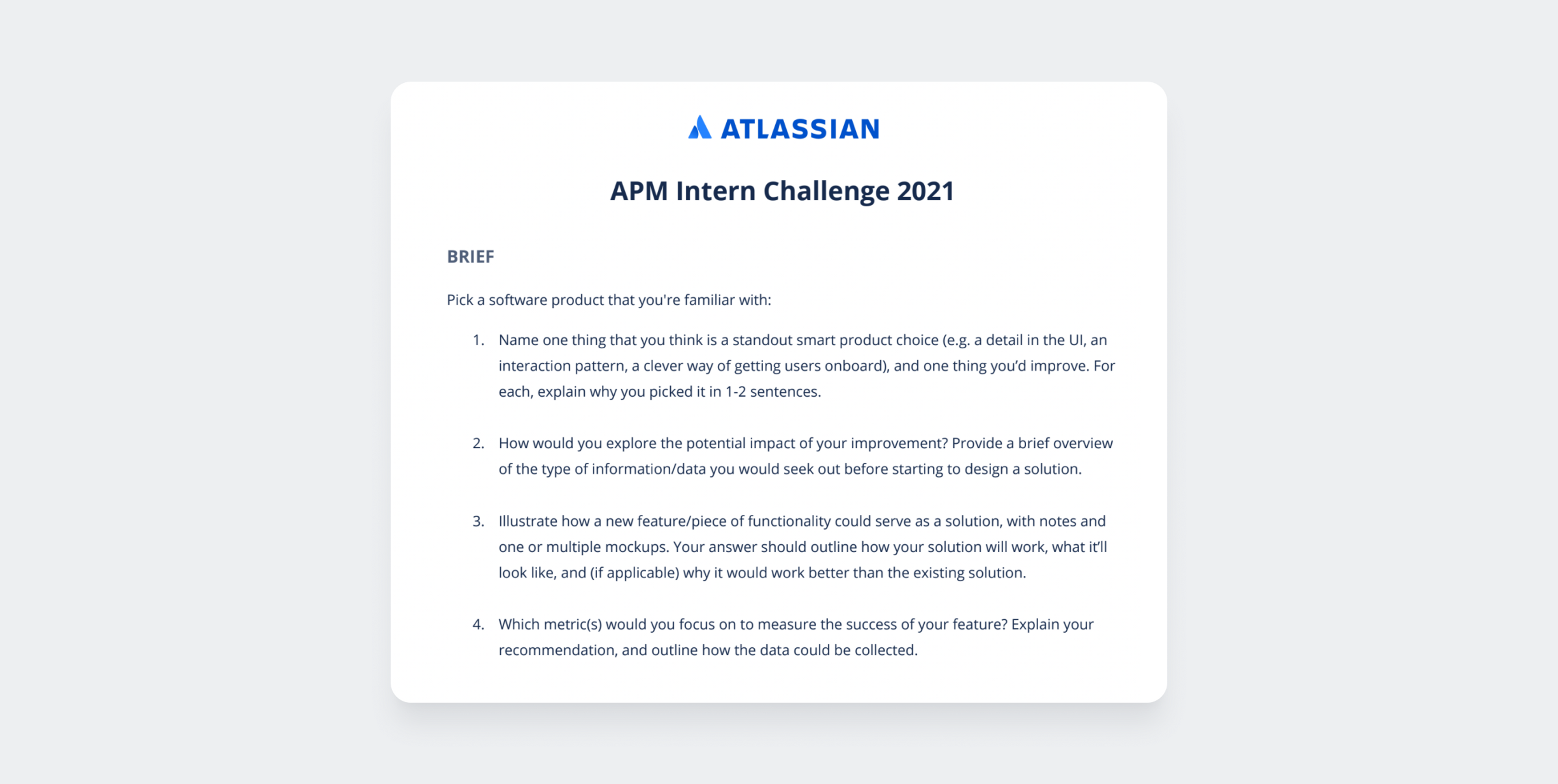 Below is last year’s prompt. For aspiring Atlassian APMs, I recommend running through it with a PM coach to get an idea of the flow and to practice in real time.