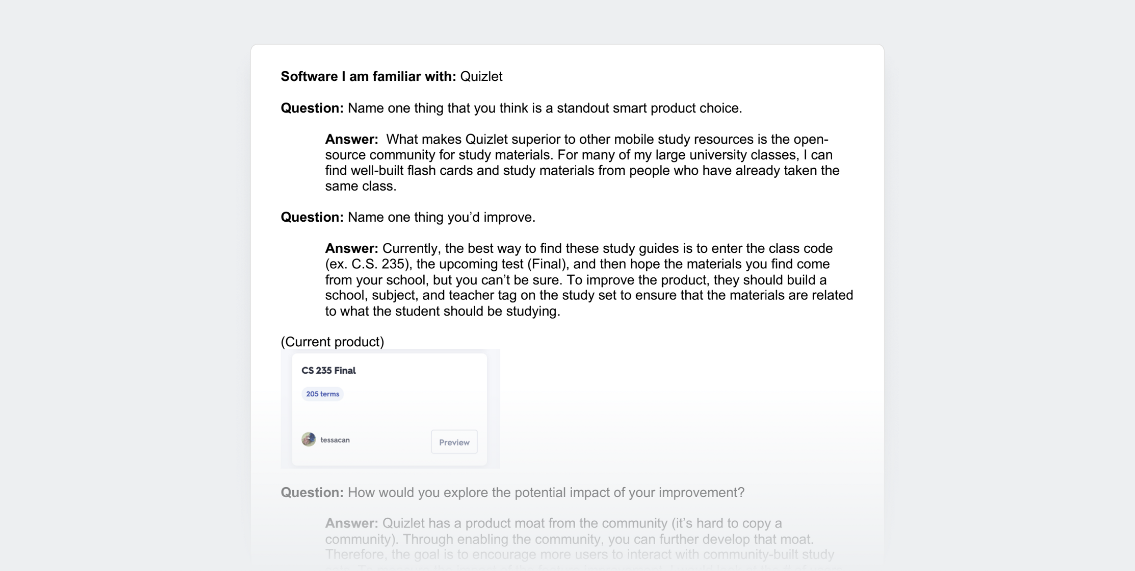 This is what’s known as an “execution interview.” They tell you exactly what they’re looking for and want to see if you can fulfill the requirements. During my take-home challenge, I chose Quizlet. Here are my responses to a few of the questions: