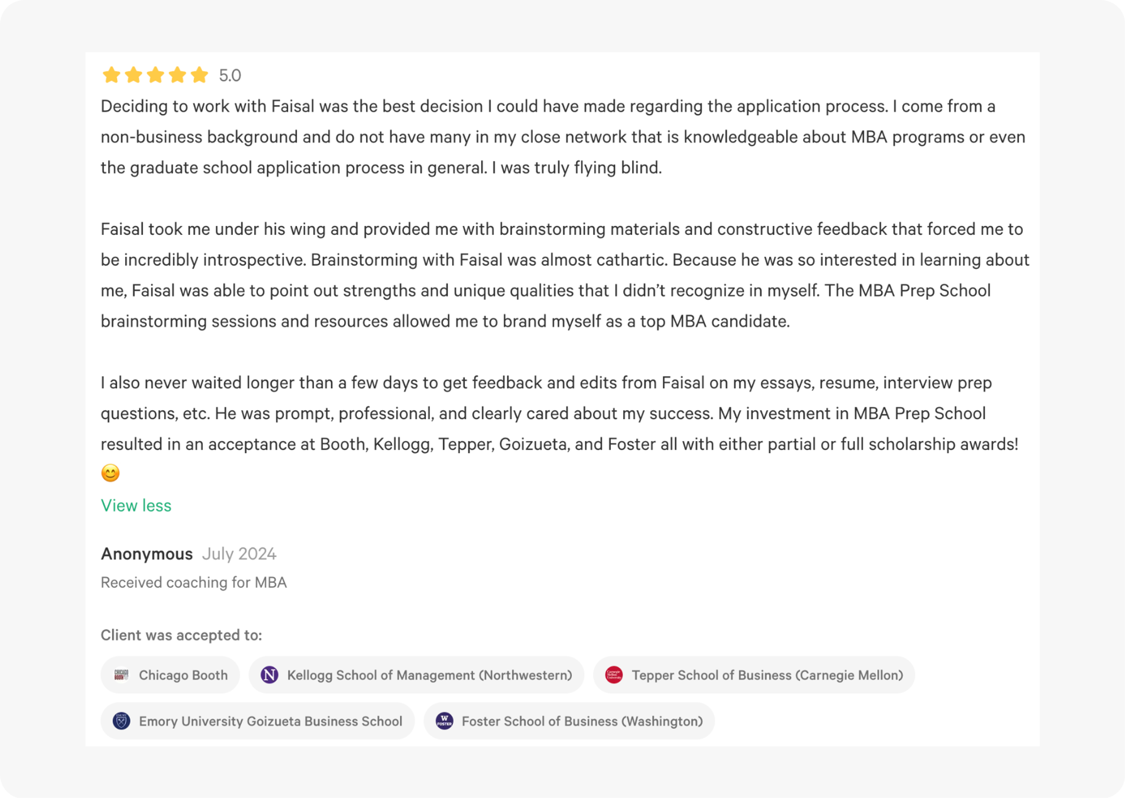 Coaching Specialty: School selection, essays, interview prep, and understanding the value proposition of different top business schools